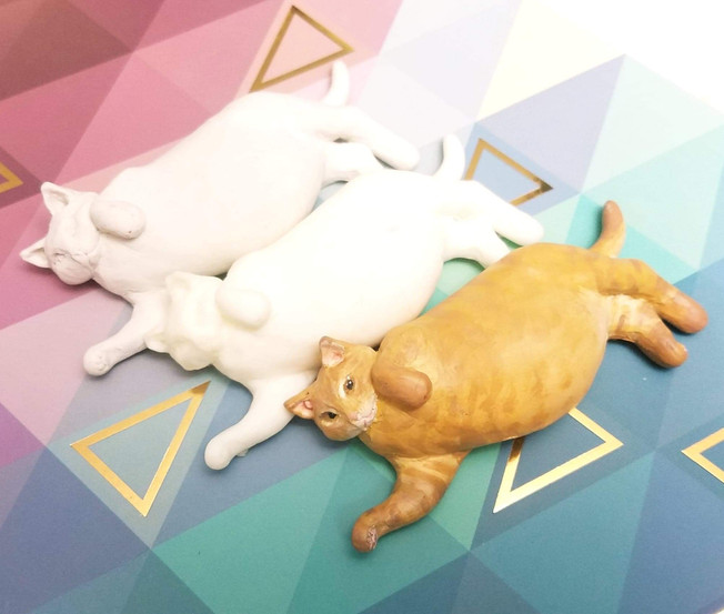 The Kitty mold is of a fat cat lying on its side/back and is about 2"L x 4.5"W x 1"H . Does your pet look like Kitty? Minor changes can be made via sanding and Apoxie Sculpt to make this cast look more like your baby. The resin casts are then painted to match your pet's patterns and markings.