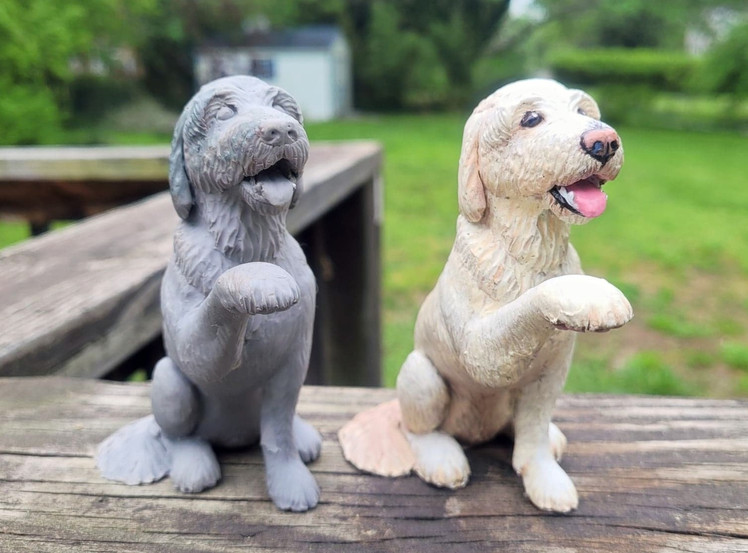 The Malana mold is of a Doodle dog in a sitting position with a paw up for attention and is about "L x "W x "H . Does your pet look like Malana? Minor changes can be made via sanding and Apoxie Sculpt to make this cast look more like your baby. The resin casts are then painted to match your pet's patterns and markings. Pictures of your pet from the front, left, right, and behind as well as specific alterations to the cast should be sent to mirandali.art@gmail.com.