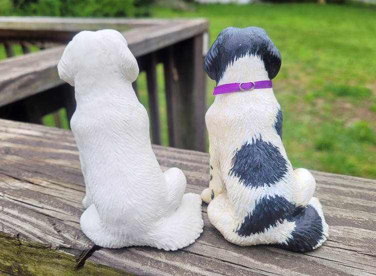 The Nana mold is of a sitting Newfoundland dog and is about "L x "W x "H. Does your pet look like Nana? Minor changes can be made via sanding and Apoxie Sculpt to make this cast look more like your baby. The resin casts are then painted to match your pet's patterns and markings.