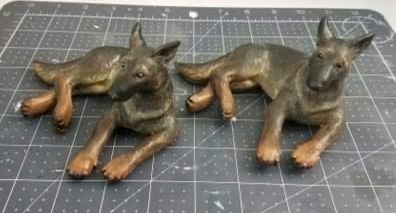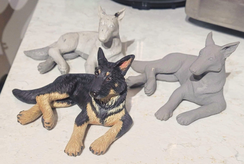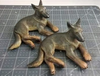 The Thunder mold is of a German Shepherd lying down and is about about "L x "W x "H.. Does your pet look like Thunder? Minor changes can be made via sanding and Apoxie Sculpt to make this cast look more like your baby. The resin casts are then painted to match your pet's patterns and markings.